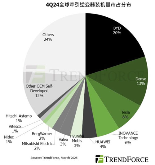 根據(jù)TrendForce集邦咨詢最新研究,2024年第四季全球電動(dòng)車[注1]牽引逆變器總裝機(jī)量達(dá)867萬臺(tái),季增26%。中國與歐洲市場(chǎng)的強(qiáng)勁需求為主要?jiǎng)幽?,帶?dòng)純電動(dòng)車(BEV)、插電混合式電動(dòng)車(PHEV)的裝機(jī)量皆較前一季成長(zhǎng)28%,并一舉將華為推進(jìn)全球前五大供應(yīng)商之列。